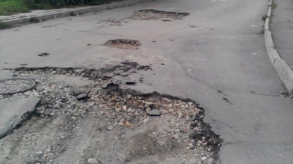После схода снега сошел и асфальт почти везде. Вот такая яма в самом центре города